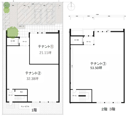 | 募集区画・面積 | ①1階:21.11坪(薬局) ②1階:32.38坪 ③2階・3階:各53.50坪 |